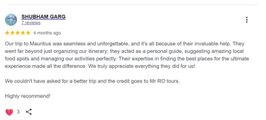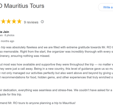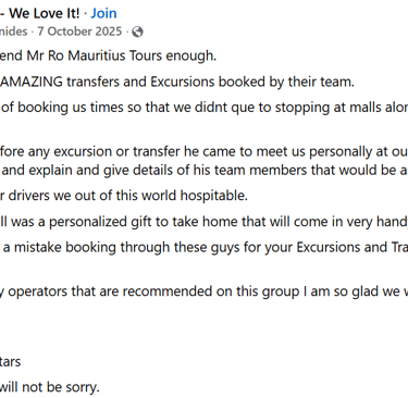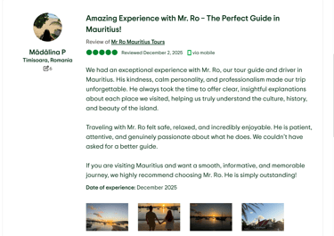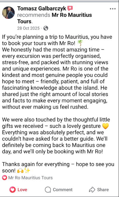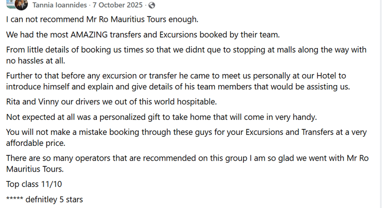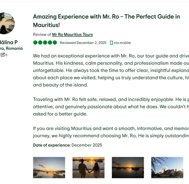 AIR DAY TOURS - Experience the beauty of Mauritius with our us, we are dedicated to make your trip in Mauritius unforgettable. With a welcoming demeanor, our reliable guide takes you on a joyful journey around the island, sharing hidden gems and local insights that will enrich your visit. Whether you’re exploring picturesque beaches, vibrant markets, or lush landscapes, you’ll feel the warmth of Mauritian hospitality.